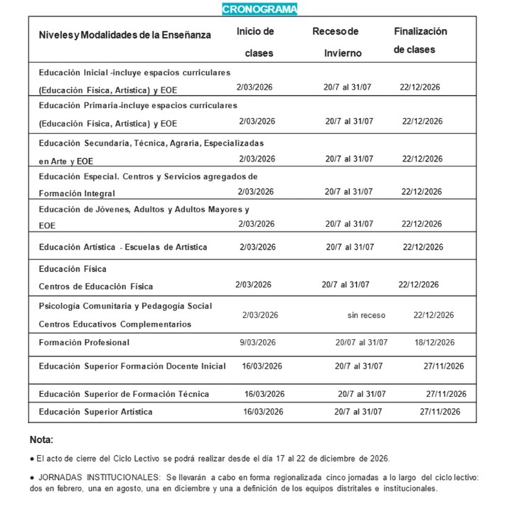 La resolución también fija la realización de cinco jornadas institucionales a lo largo del ciclo lectivo: dos en febrero, una en agosto, una en diciembre y una adicional a definir por los equipos distritales e institucionales. Asimismo, se establece que el acto de cierre del ciclo lectivo podrá realizarse entre el 17 y el 22 de diciembre.