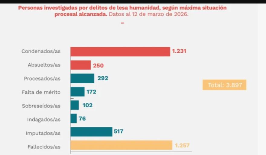 Sobre un total de 3.897 personas investigadas en las últimas dos décadas, hubo 1.231 condenados, 250 absueltos, 292 procesados, 172 con Falta de mérito, 102 sobreseídos, 76 indagados, 571 imputados y 1.257 fallecidos.