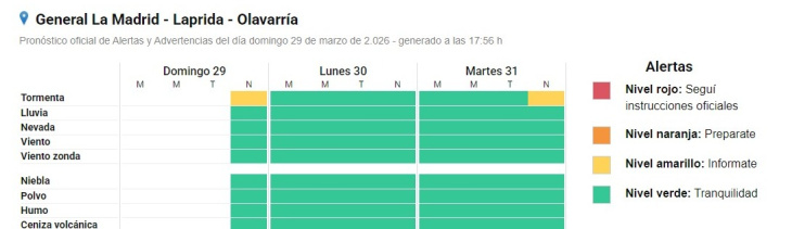 En cuanto al pronóstico, el Servicio Meteorológico Nacional indica que rige una alerta amarillo por tormentas para la noche de este domingo, con probabilidad de precipitaciones intensas.
