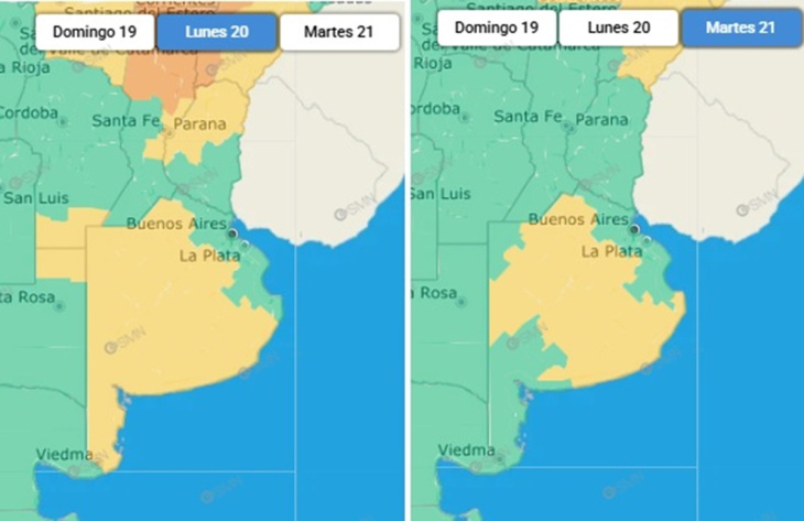 Tras el paso del frente de tormenta, las condiciones comenzarán a mejorar hacia el miércoles, con un cambio en la masa de aire que traerá un descenso marcado de la temperatura.