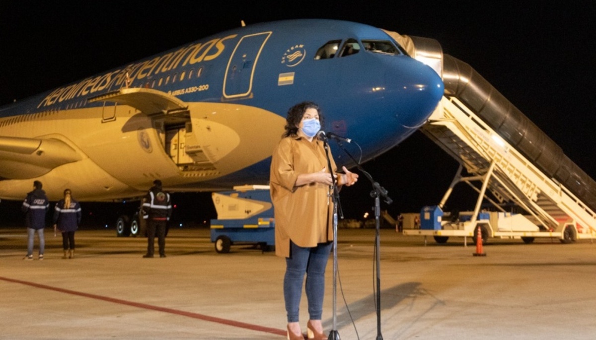 Vizzotti arribó a Ezeiza a bordo del avión de Aerolíneas Argentinas que trajo desde China 768.000 dosis de Sinopharm. Subió a ese vuelo en Madrid, donde el aparato hizo una escala técnica.